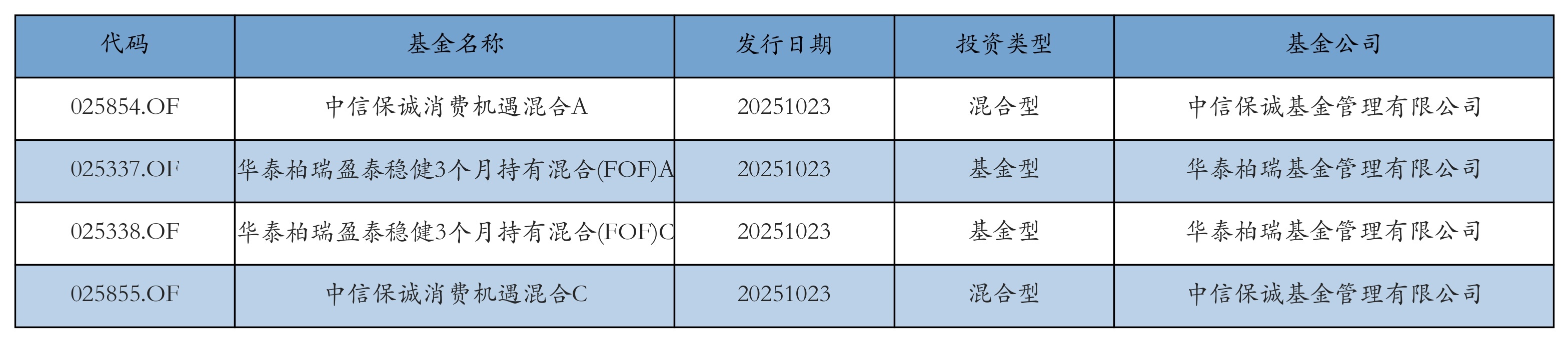 昨日有4只新基金发行,分别为:中信保诚消费机遇混合A、华泰柏瑞盈泰稳健3个月持有混合(FOF)A、华泰柏瑞盈泰稳健3个月持有混合(FOF)C、中信保诚消费机遇混合C,详情见下表: