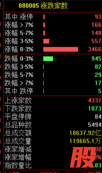 市场共4337只个股上涨,其中93只个股涨停;1073只个股下跌。