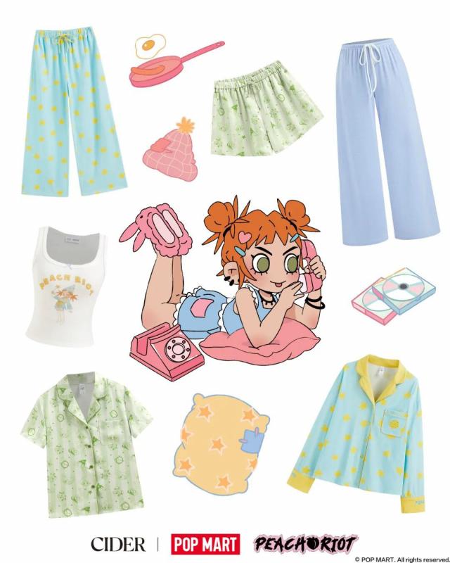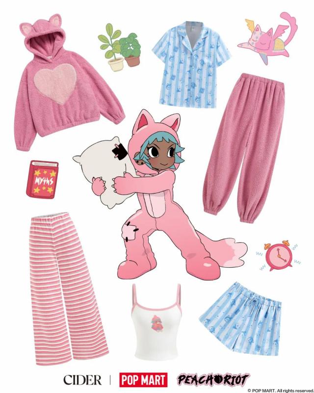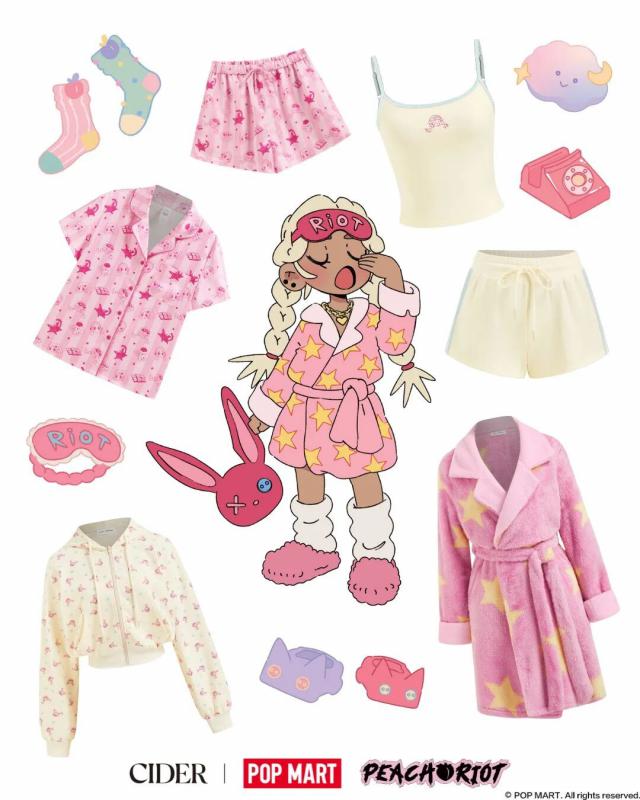 两个品牌联手打造的"睡衣派对"联名系列,更像是一场早有默契的双向奔赴。作为泡泡玛特在北美首次涉足时尚领域的尝试,Peach Riot 与 CIDER 的合作绝非偶然。