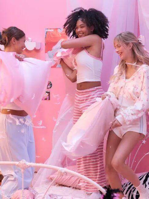 整个系列散发着青春洋溢的气息,设计中既保留了甜美元素,又注入了不羁的个性,营造出一种慵懒却潮酷的派对氛围。无论是宽松舒适的剪裁、明亮活泼的配色,还是细节处充满态度的图案,都精准捕捉到了 Z 世代想要的俏皮与自信。