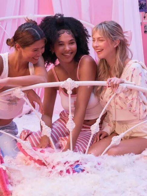 当然,还有开头提到的与泡泡玛特 Peach Riot 的联名系列。两个品牌灵魂契合,将「睡衣派对」的概念转化为一场慵懒又潮酷的视觉化表达,精准捕捉了 Z 世代想要的俏皮与自信。